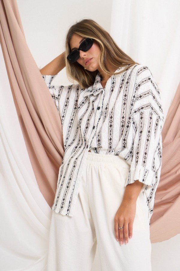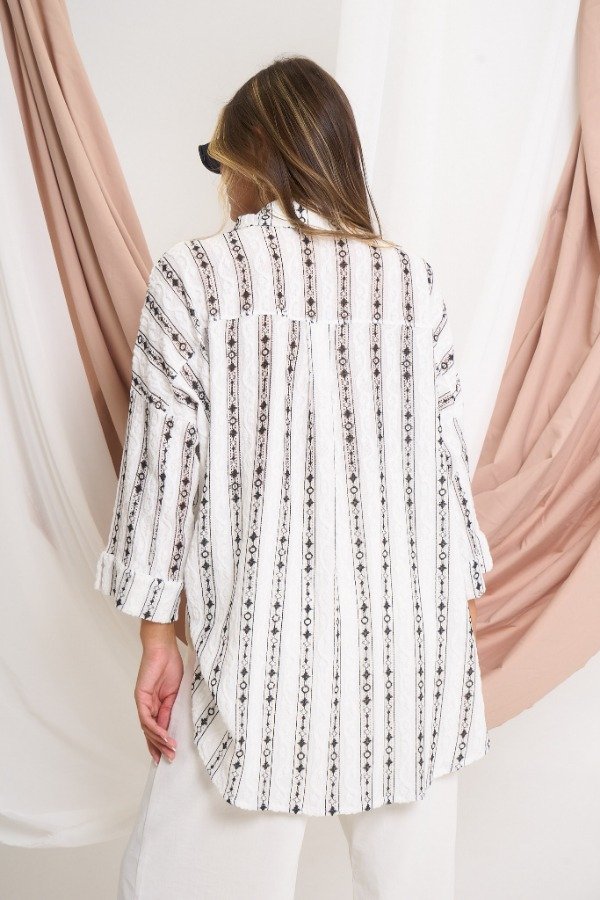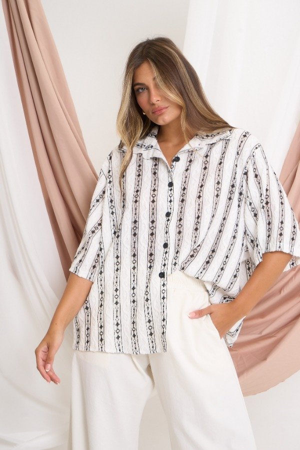 Camisola confeccionada en broderie de punto. Irregular, más larga atrás. Con mangas 3/4. Combinada blanco y negro. Talle U. Medidas: contorno de busto 132 cm, contorno de cintura 132 cm, contorno de cadera 132 cm, largo delantero 66 cm y largo trasero 84 cm