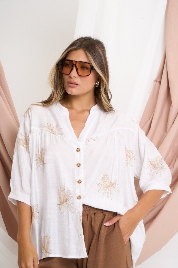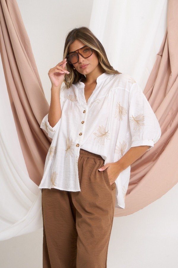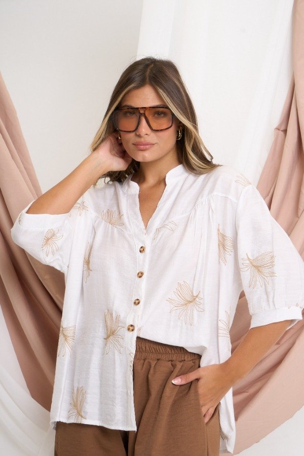 Camisola confeccionada en lino twill bordado. Con mangas 3/4 y canesú en el frente y en la espalda. Color blanco con bordado chocolate. Talle U. Medidas: contorno de busto 122 cm, vontorno de cintura 138 cm, contorno de cadera 140 cm y largo 66 cm