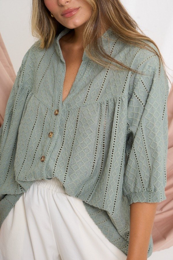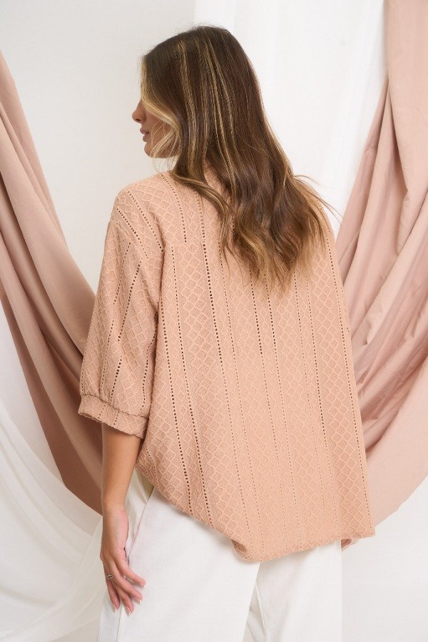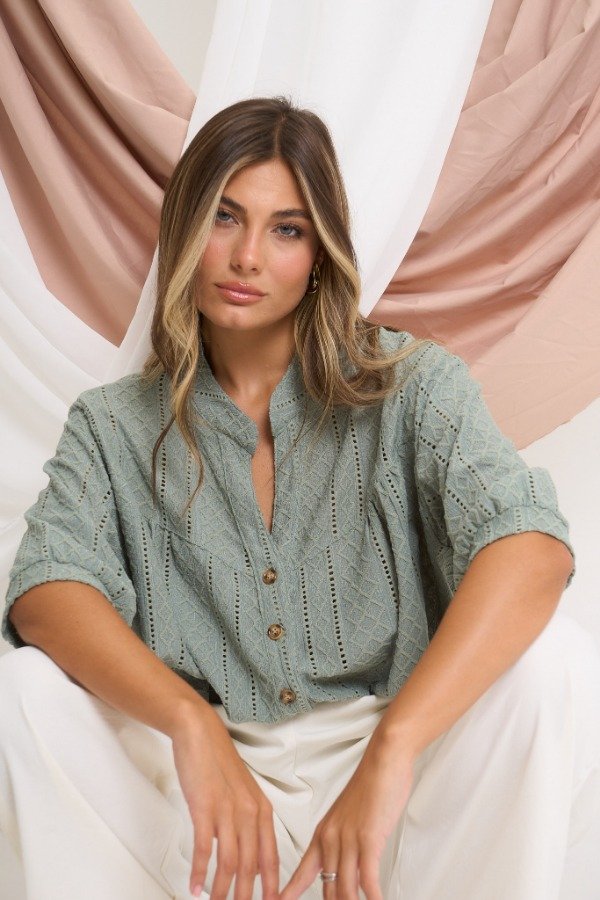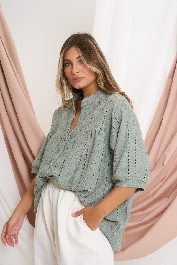 Camisola confeccionada en broderie de punto, con mangas 3/4, y canesú en el frente y en la espalda. Colores camel y verde. Talle U. Medidas: contorno de busto 136 cm, contorno de cintura 170 cm, contorno de cadera 172 y largo 66 cm