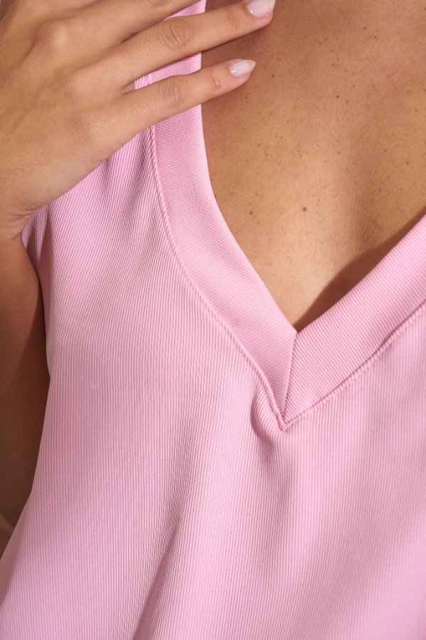 Musculosa confeccionada en morley de seda, con escote en V profundo y sisa profunda. Colores blanco, negro, rosa y celeste. Talle U (XL aprox). Medidas: contorno de busto 90 cm, contorno de cintura 100 cm, contorno de cadera 109 cm y largo 60 cm.