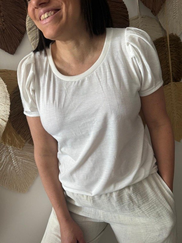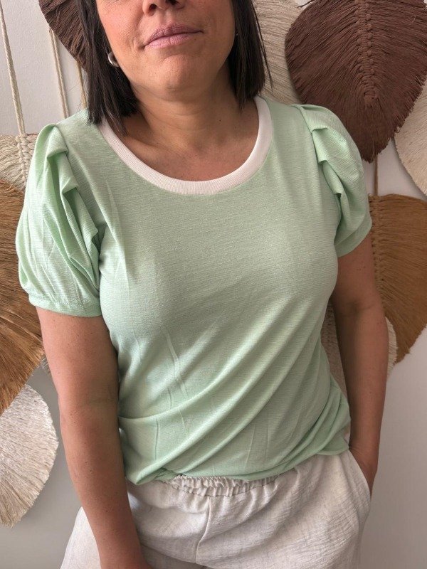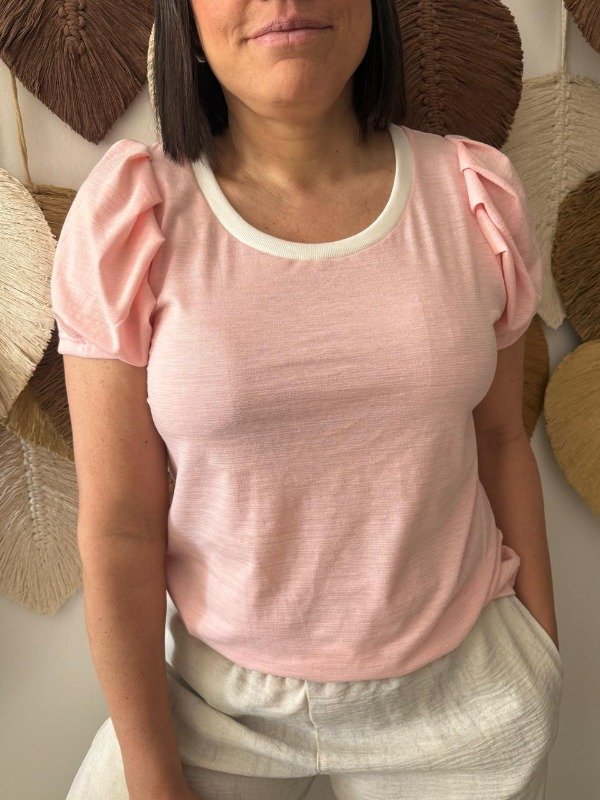 Remera confeccionada en algodón flamé, con mangas princesa. Colores blanco, rosa y pistacho. Talle U. Medidas: contorno de busto 92 cm, contorno de cadera 108 cm y largo 58 cm
