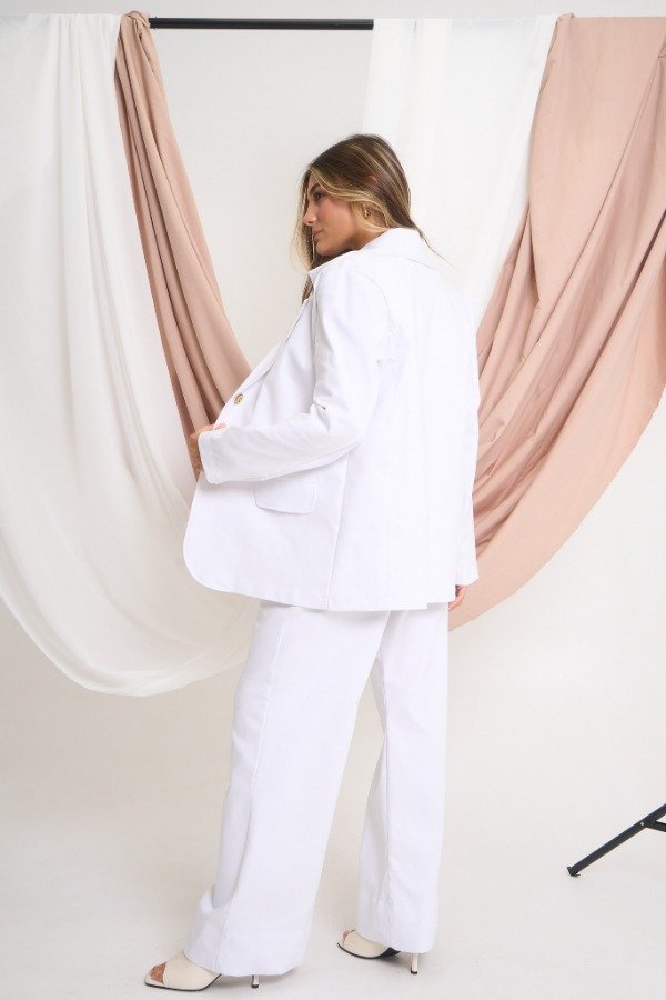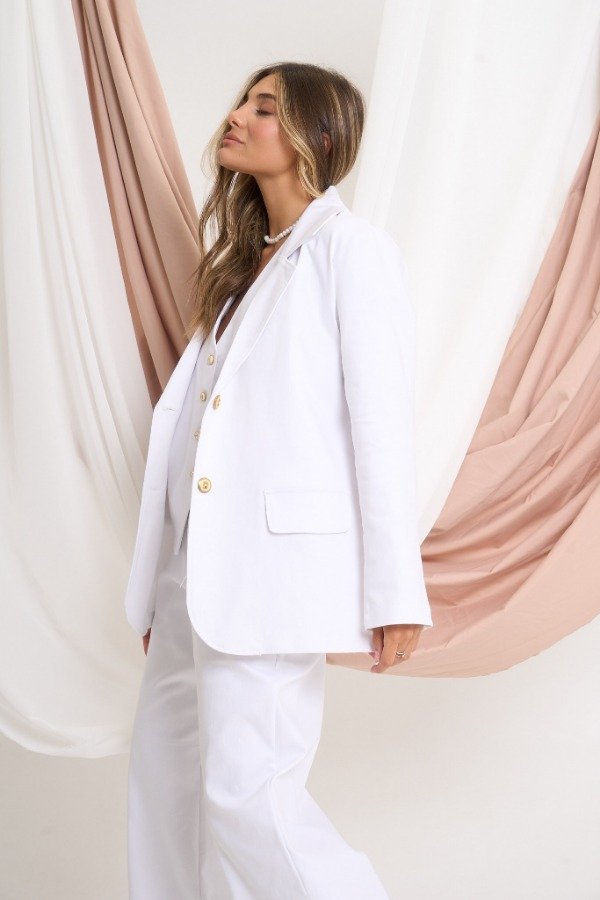 Blazer confeccionado en gabardina elastizada. Con 2 botones de fantasía. Color blanco. Talle U. Medidas: contorno de busto 104 cm, contorno de citnura 100 cm, contorno de cadera 102 cm y largo 69 cm