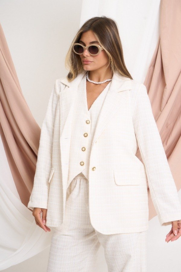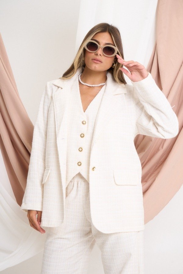 Blazer confeccionado en tela ¨Chanel¨, tramada, con hilos de lurex dorados. Con 2 botones de fantasía. Color natural. Talle U. Medidas: contorno de busto 108 cm, contorno de cintura 104 cm, contorno de cadera 108 cm y largo 69 cm