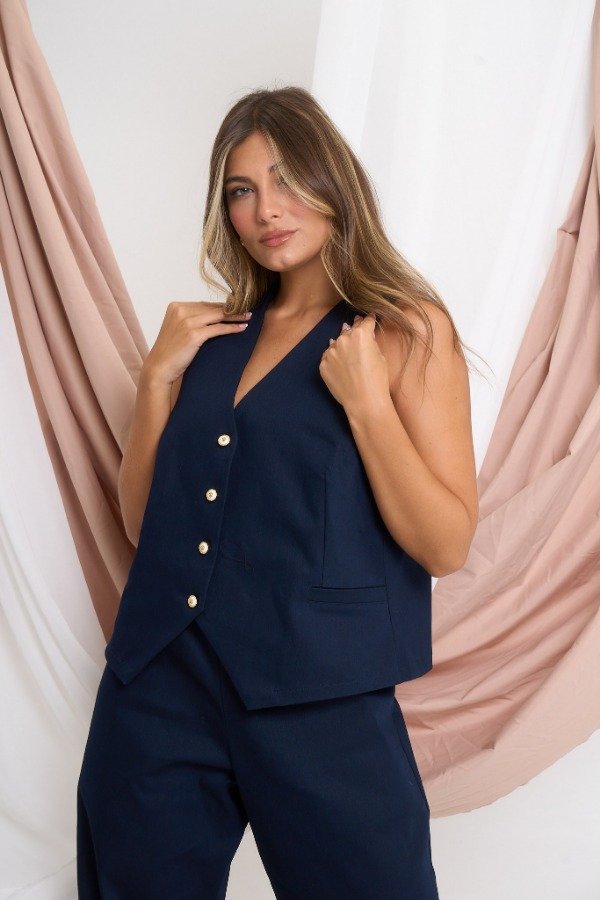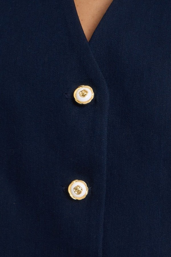 Chaleco confeccionado en gabardina elastizada. Con 4 botones de rositas en dorado y blanco. Color azul marino. Talle U. Medidas: contorno de busto 104 cm, contorno de cintura 104 cm, contorno de cadera 108 cm y largo 52 cm