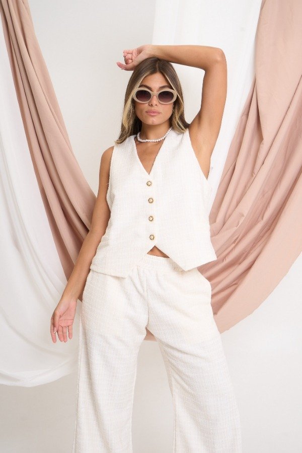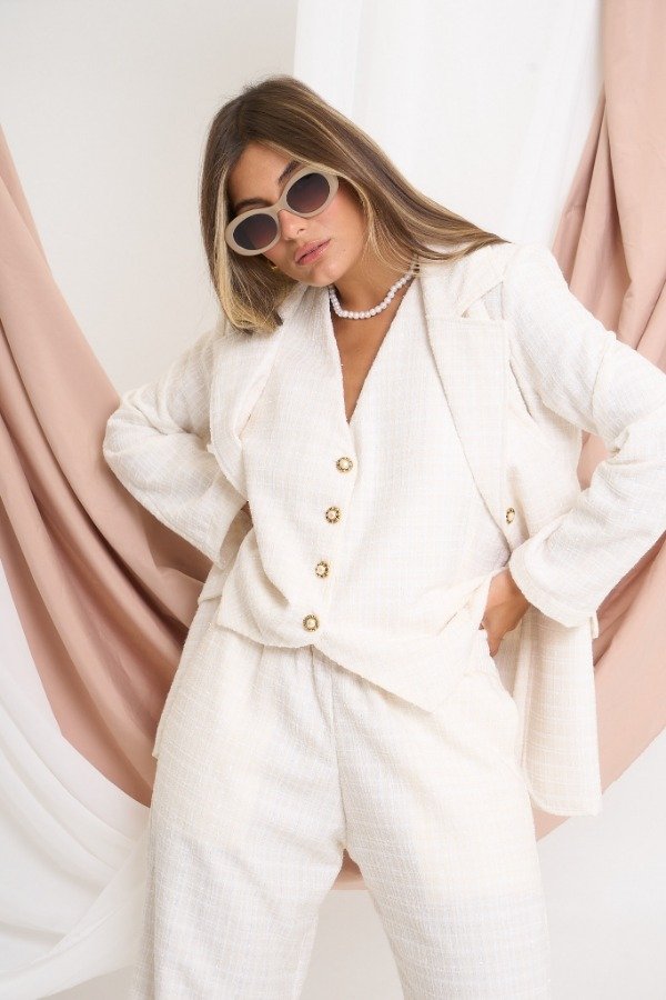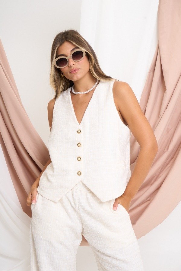 Chaleco confeccionado en ¨Chanel¨, de tela tramada con hilos de lurex dorados, y 4 botones fantasía de rositas doradas y blancos. Color natural. Talle U. Medidas: contorno de busto 104 cm, contorno de cintura 106 cm, contorno de cadera 110 cm y largo 52 cm