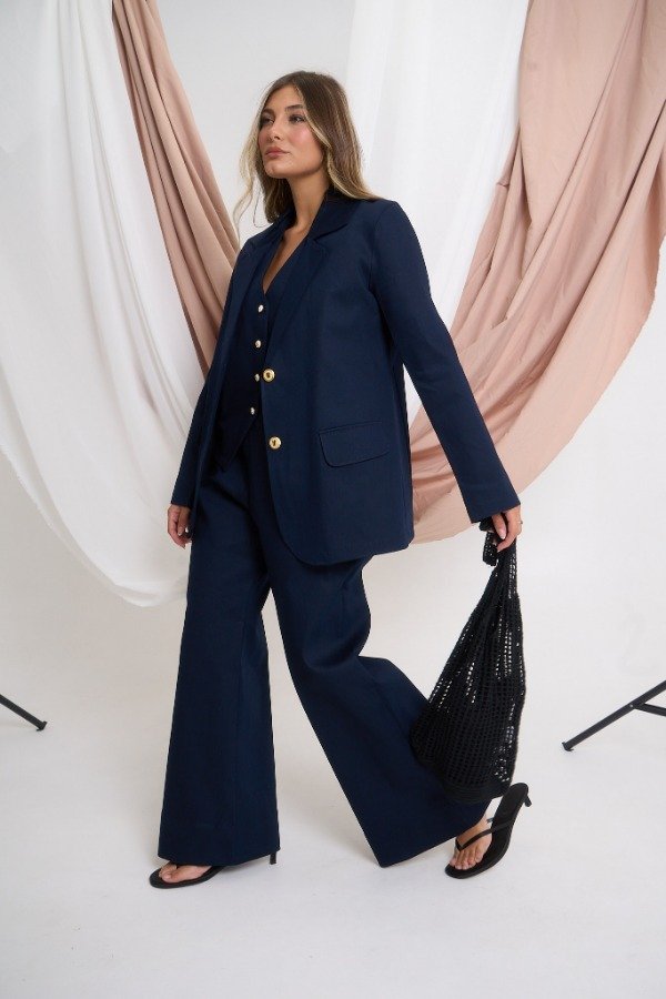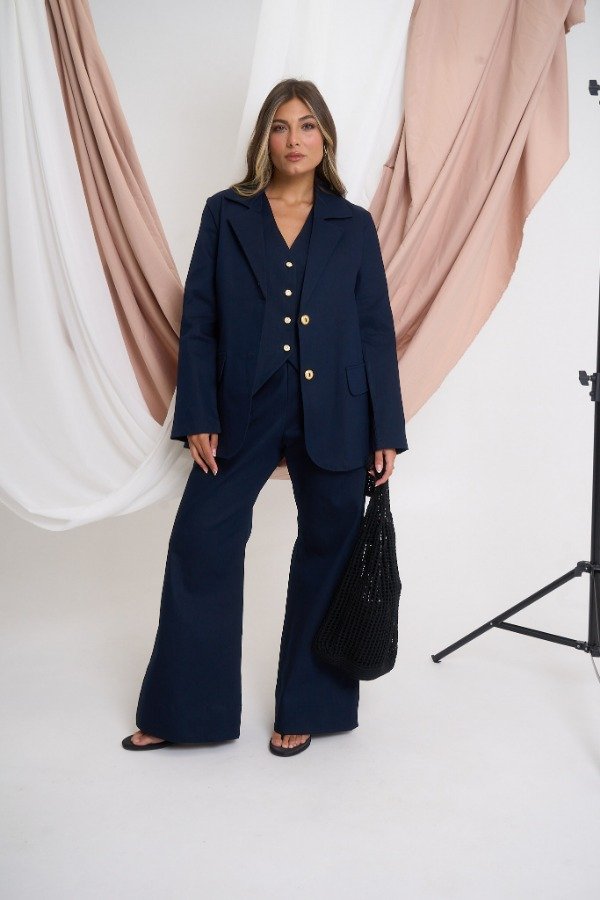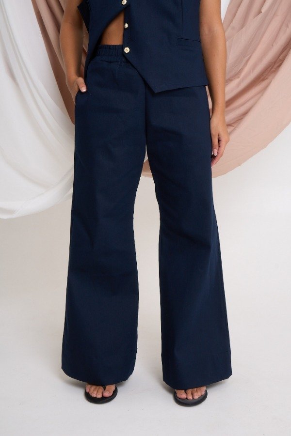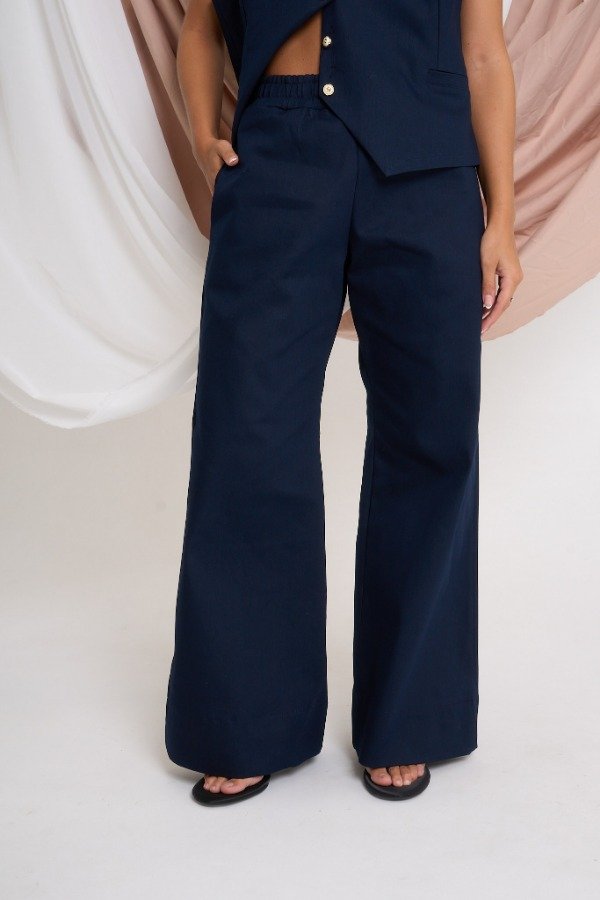 Pantalón confeccionado en gabardina elastizada, con cintura elastizada y bolsillos laterales. Color azul marino. Talle U. Medidas: contorno de cintura elastizada 102 cm, contorno de cadera 110 cm y largo 102 cm
