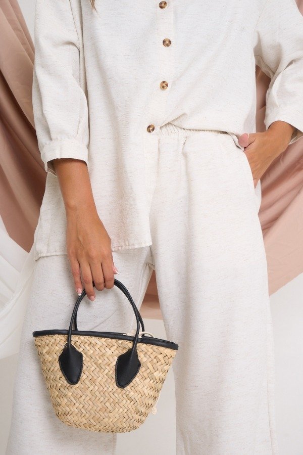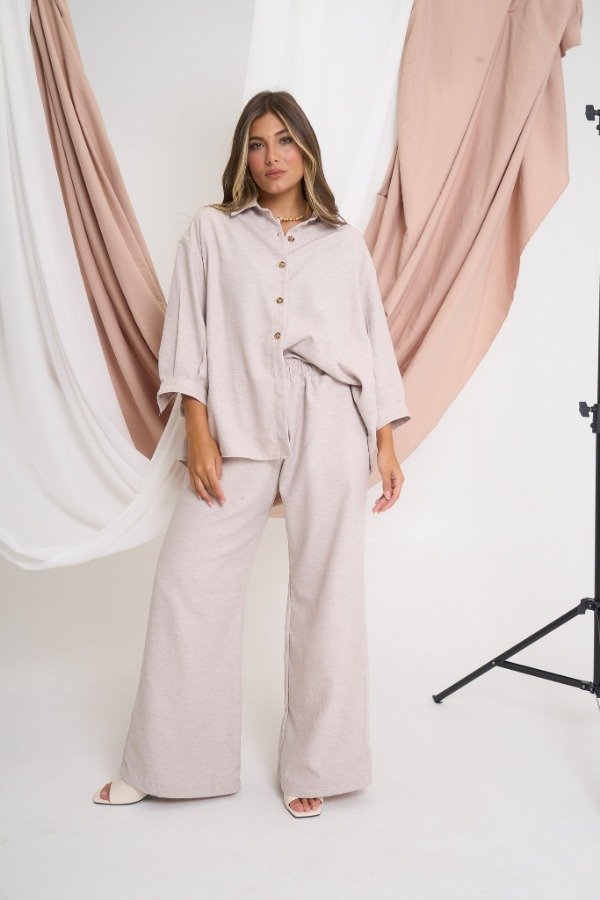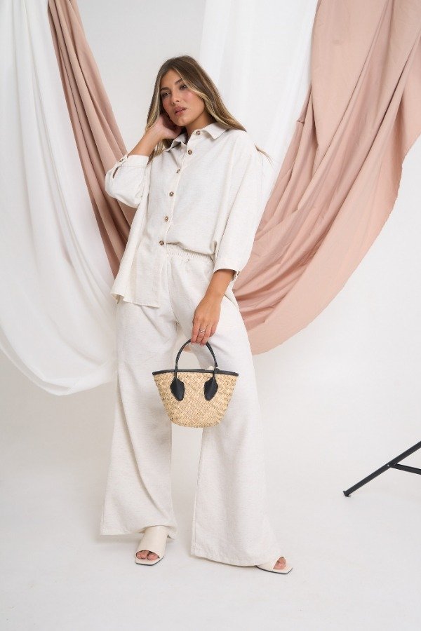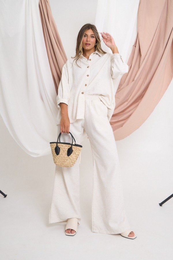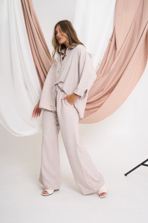 Pantalón confeccionado en sarga jaspeada, con cintura elastizada y bolsillos laterales. Colores natural y beige. Talle U. Medidas: contorno de cintura estirada 100 cm, contorno de cadera 110 cm y largo 102 cm