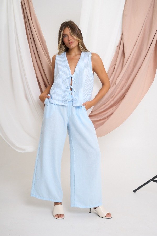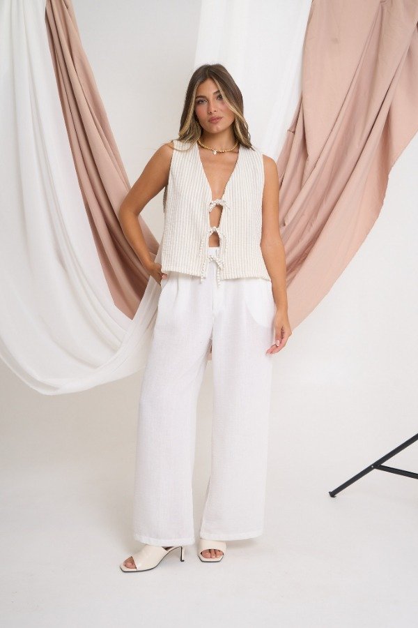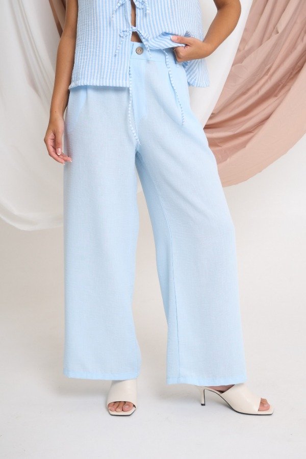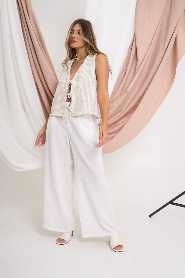 Pantalón confeccionado en lino quebrado, con media cintura elastizada, falsa cartera, precillas, pinzas, bolsillos laterales y 1 botón de coco. Colores blanco, celeste y rosa. Talle U (aprox L/XL). Medidas: contorno de cintura estirada 106 cm, contorno de cadera 126 cm y largo 100 cm