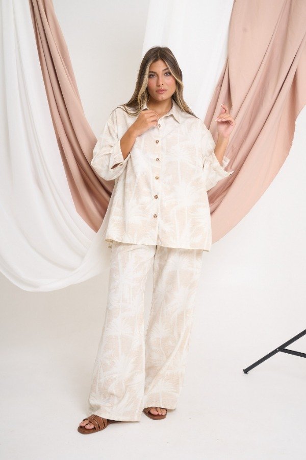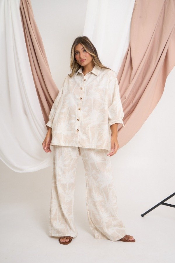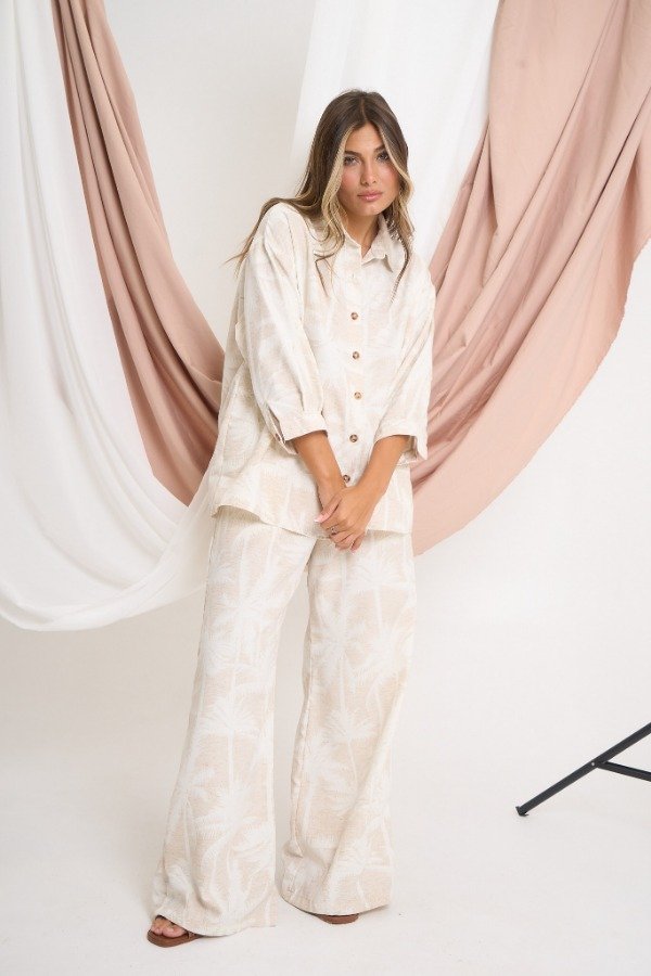 Pantalón confeccionado en sarga rústica estampada. Con cintura elastizada y bolsillos laterales. Talle U. Medidas: contorno de cintura estirada 106 cm, contorno de cadera 114 cm y largo 105 cm