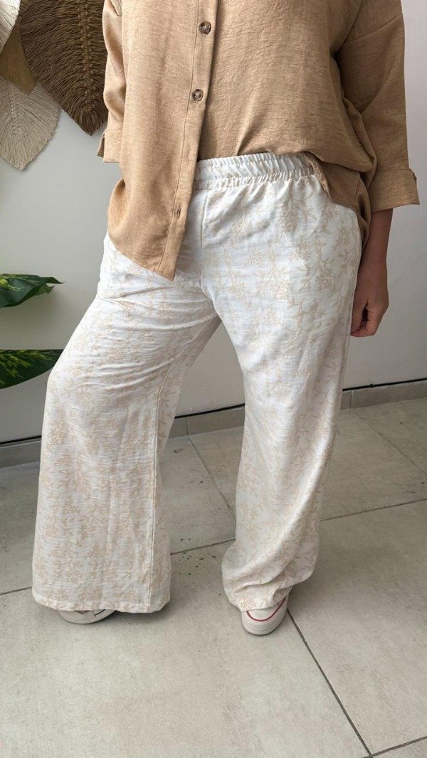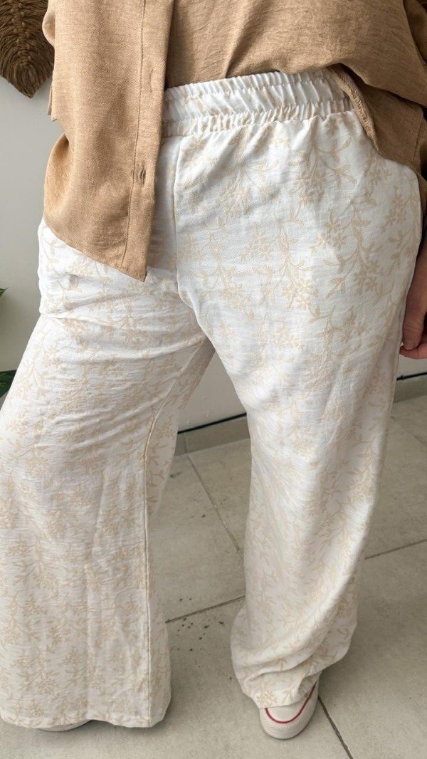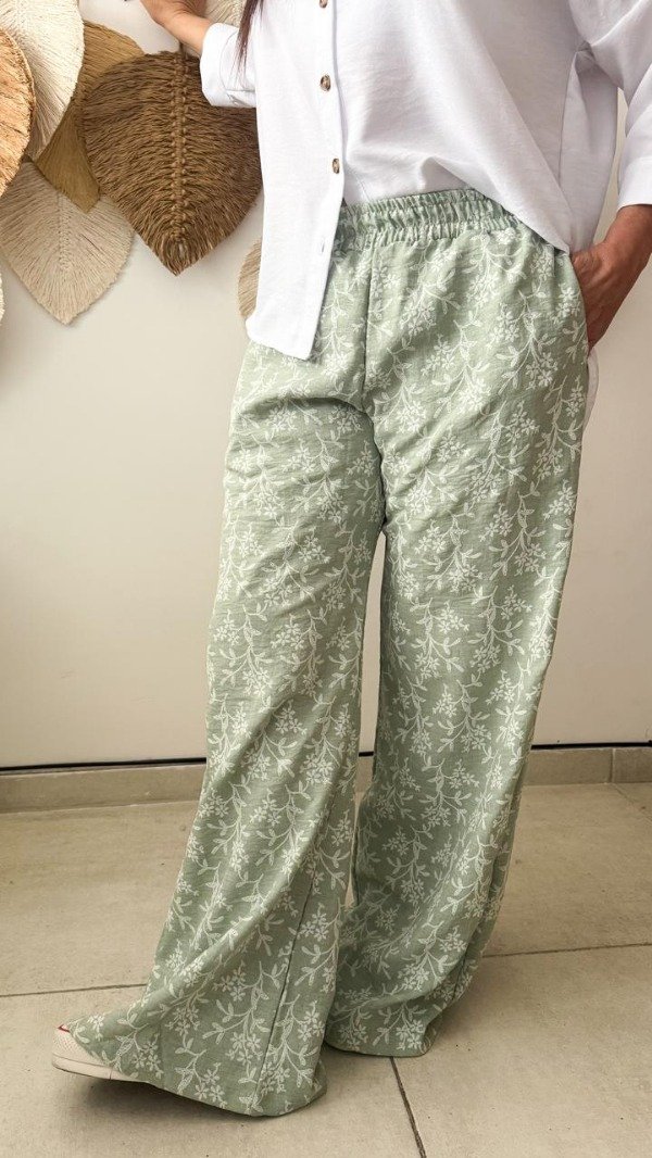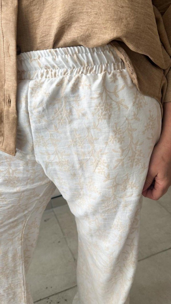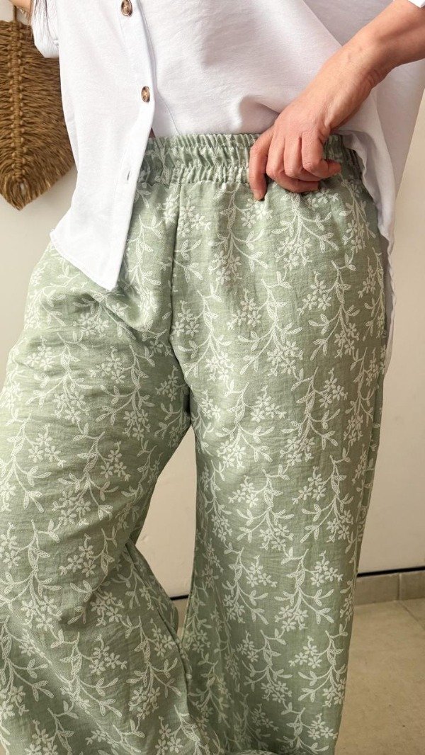 Pantalón confeccionado en lino rústico bordado. Con cintura elastizada y bolsillos laterales. Color blanco y verde. Talle U. Medidas: contorno de cintura estirada 112 cm, contorno de cadera 116 cm y largo 104 cm