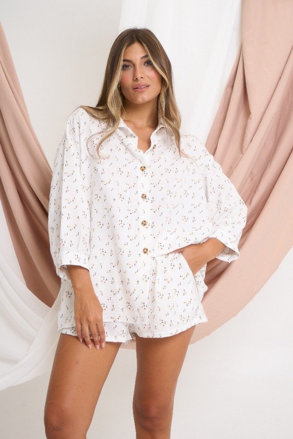 Short liberty confeccionado en lino rústico. Con cintura elastizada y bolsillos laterales. Colores celeste, rosa y blanco. Talle U. Medidas: contorno de cintura estirada 110 cm, largo trasero 33 cm y largo delantero 28 cm