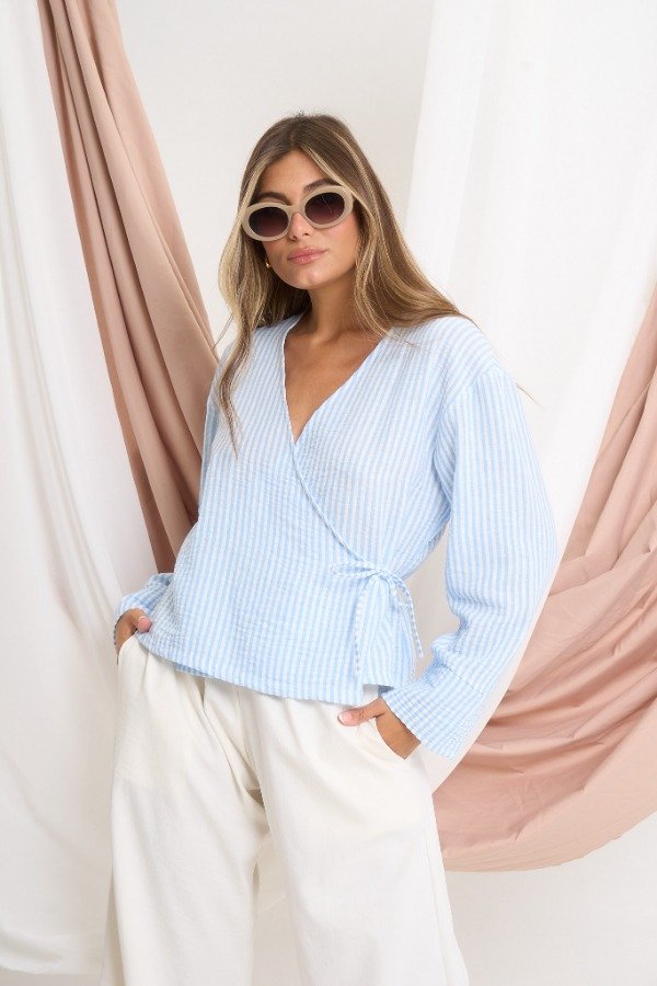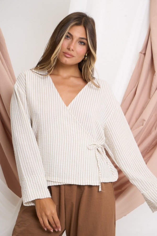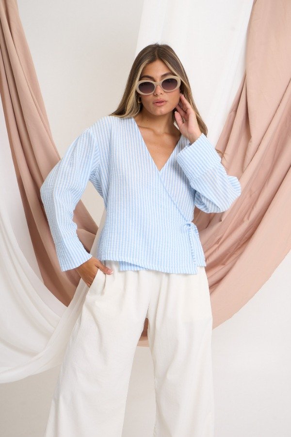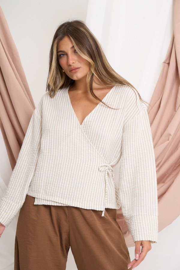 Blusa confeccionada en lino rústico, rayado, con escote en V, cruce y lazo, con mangas con puño ancho. Colores beige y celeste. Talle U (aprox L). Medidas: contorno de busto 104 cm, contorno de cintura 98 cm, contorno de cadera 104 cm y largo 56 cm.