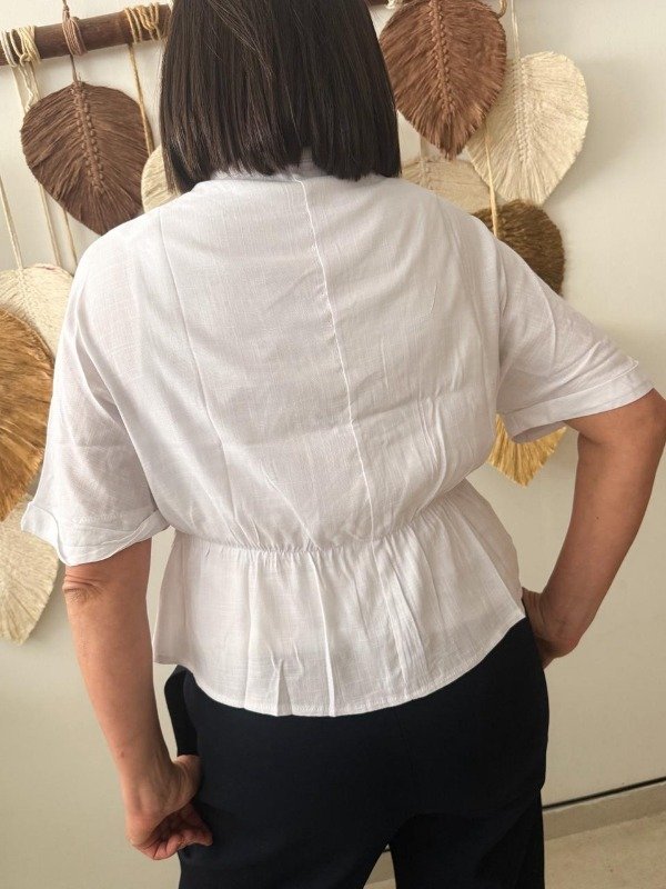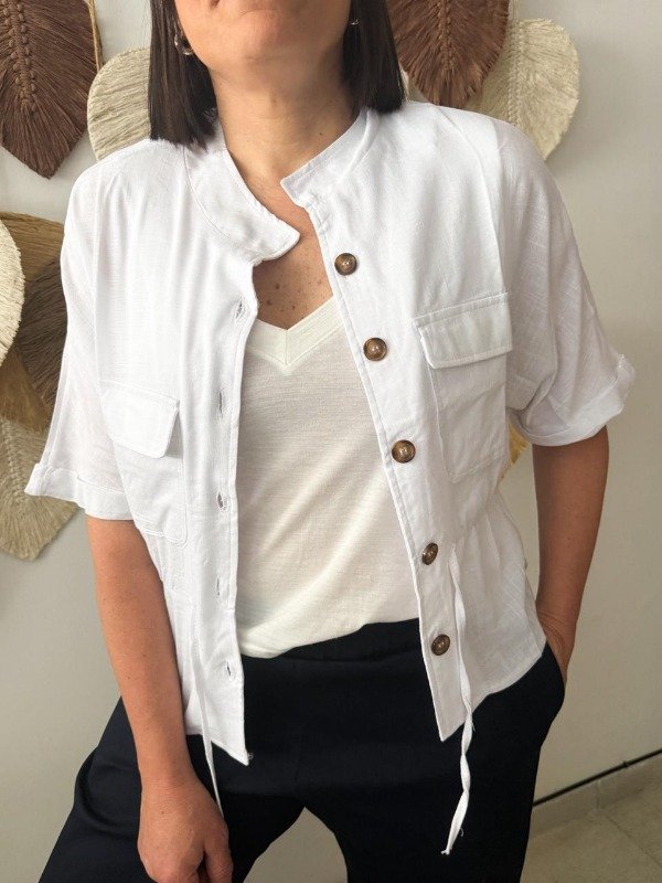 Camisa confeccionada en lino. Con elástico en la cintura y lazo. Tiene dos bolsillos frontales. Color blanco. Talle U. Medidas: contorno de busto 108 cm, contorno de cintura estirada 120 cm y largo 51 cm