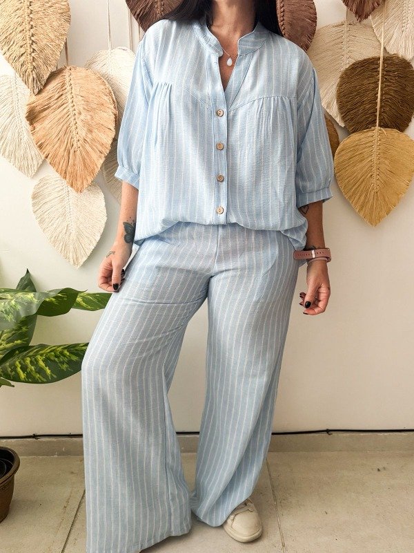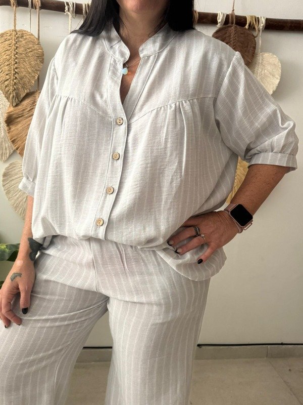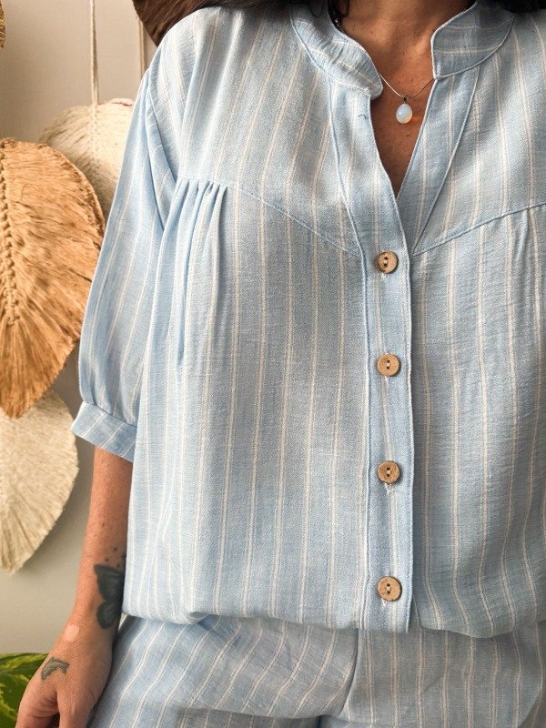 Camisola confeccionada en lino rayado. Colores celeste y cemento. Con mangas 3/4 y canesú en el frente y en la espalda. Talle U. Medidas: contorno de busto 122 cm, contorno de cintura 140 cm, contorno de cadera 142 cm y largo 76 cm